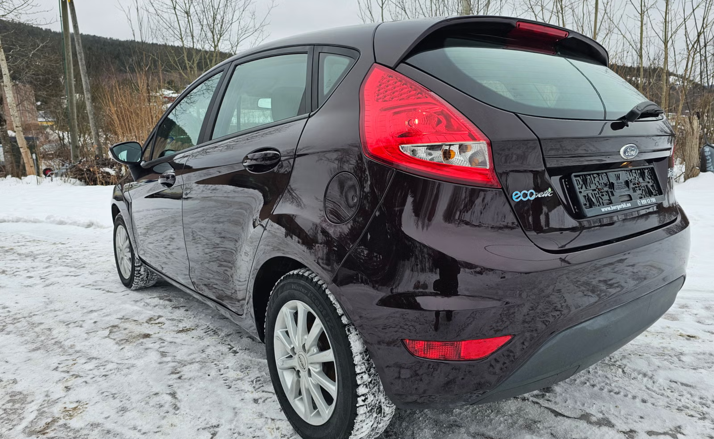 Hel og fin Ford Fiesta, med en knallfin mørk burgunderrød farge.